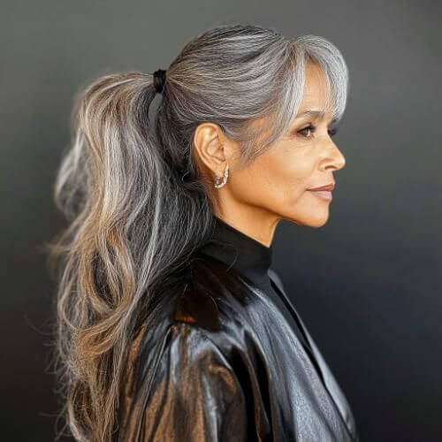 Ponytails with bangs are a chic, convenient, and ageless option for women over 60 with long hair. A simple ponytail paired with long, side-swept bangs or wispy fringe offers a playful and youthful appearance, while remaining practical and easy to style.