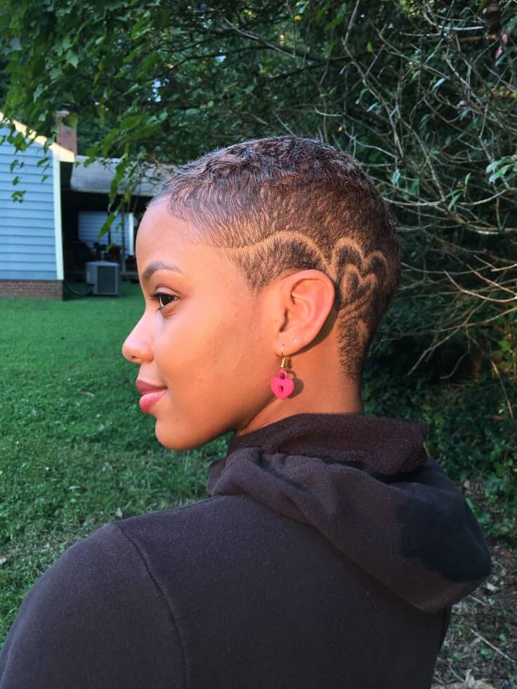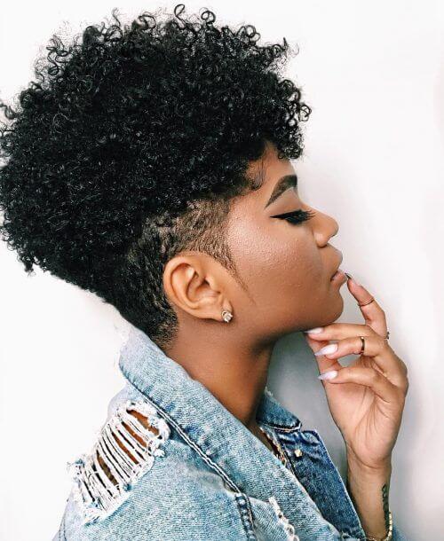 • Shaves sides or back and keeps natural curls intact on top for a rugged yet refined look. This style is one of the low-maintenance short natural haircuts for black females that looks especially flattering for black women who have coily hair textures because it honors and flaunts the natural curl pattern. It fuses edginess with natural texture.